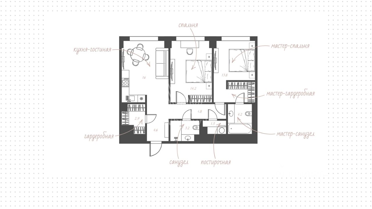 Квартира с двумя спальнями площадью 65 м² в комплексе Sydney City на набережной Москвы-реки. Квартира с отделкой White box от застройщика расположена на 11 этаже в корпусе 5.2.