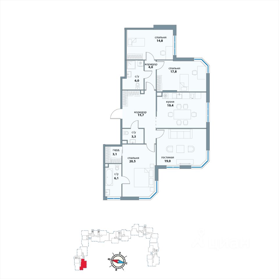 Продается 4-комнатная квартира в ЖК "Событие 3" на 25-м этаже. Общая площадь лота составляет 129.80 кв. м, из которых 19.40 кв. м отведено под просторную кухню-гостиную. 1 раздельный санузел. . В квартире выделены мокрые зоны, установлены двойные стеклопакеты, заведены инженерные коммуникации (электричество, водоснабжение), есть счетчики. Квартира расположена в жилой квартал "Событие-3", корпус 1 (секция 1). В каждом подъезде запроектировано 5 квартир на этаж, есть пассажирский и грузовой лифты. ЖК СОБЫТИЕ - это престижный квартал в Раменках от компании ДОНСТРОЙ. СОБЫТИЕ 3 - корпус, занимающий центральное положение в квартале. Отсюда одинаково близко до всех объектов его инфраструктуры, включая все детсады и школы. Архитектура дома вдохновлена образами будущего: его отличают разноуровневые секции с фасадами и крышами в футуристическом стиле. В доме большой выбор студий и квартир площадью 27-171 кв.м. Их отличают современные планировки, потолки высотой 3,1-3,55 м. Здесь также большой выбор редких форматов квартир - с окном в ванной, террасами, возможностью установки камина. Много ввидовых квартир с панорамным угловым остеклением, из окон которых открываются виды на природную часть парка "Событие", Сити, Поклонную гору и запад Москвы. Лобби центральных входных групп отличают потолки до 6 м, футуристический дизайн интерьера, стоек ресепшн и мебели и "парящие" биокамины. Главная особенность дома - видовые панорамные лифты. Инфраструктура дома включает детский клуб для малентких жителей дома и фитнес-рум для поклонников ЗОЖ. В доме двухуровневый подземный паркинг на 497 машиномест с возможностью установки зарядных устройств для электромобилей, автомойкой и кладовыми помещениями. Прямой лифт идет из паркинга на любой этаж. Дом и его территория закрыты от посторонних и обеспечены круглосуточной охраной, системами контроля доступа и видеонаблюдения. Двор СОБЫТИЯ 3 - один из самых больших и зеленых в квартале с чередованием активных и тихих зон, детской площадкой, воркаутом и площадкой для праздников. Прямо рядом с СОБЫТИЕМ 3 расположен главный вход в природную часть парка "Событие", который занимает более половины территории квартала и включает также спортивные, прогулочными, событийные, молодежные пространства. В СОБЫТИИ 3 планируется открыть супермаркет и кафе с летней террасой. Это часть инфраструктуры квартала СОБЫТИЕ формата "город в городе", также включающей в себя рестораны, магазины, фитнес, салоны красоты, медицинские центры и, конечно, образовательные учреждения. В квартале планируется построить две школы на 2750 мест и десять детских садов на 1200 мест. Район Раменки, где расположен квартал СОБЫТИЕ, имеет собственную развитую инфраструктуру и хорошую транспортную доступность. В 5-8 минутах ходьбы от квартала находятся станции метро "Мичуринский проспект" и "Аминьевская"; в 1-3 минутах на автомобиле - удобные выезды на Проспект Вернадского, южный дублер Кутузовского проспекта и Аминьевское шоссе; 10 минут на автомобиле до ТТК, 15