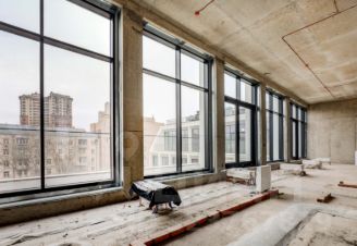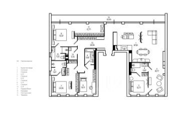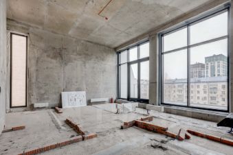 Квартира включает пять комнат и четыре совмещенных санузла, а также лоджию и балкон, окна которых выходят как на улицу, так и во двор.