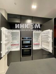 Кухонный гарнитур - американский орех, система привода BLUM, два холодильника Neff, индукционная плита Neff, вытяжка Falmec, духовой шкаф и микроволновка Smeg.