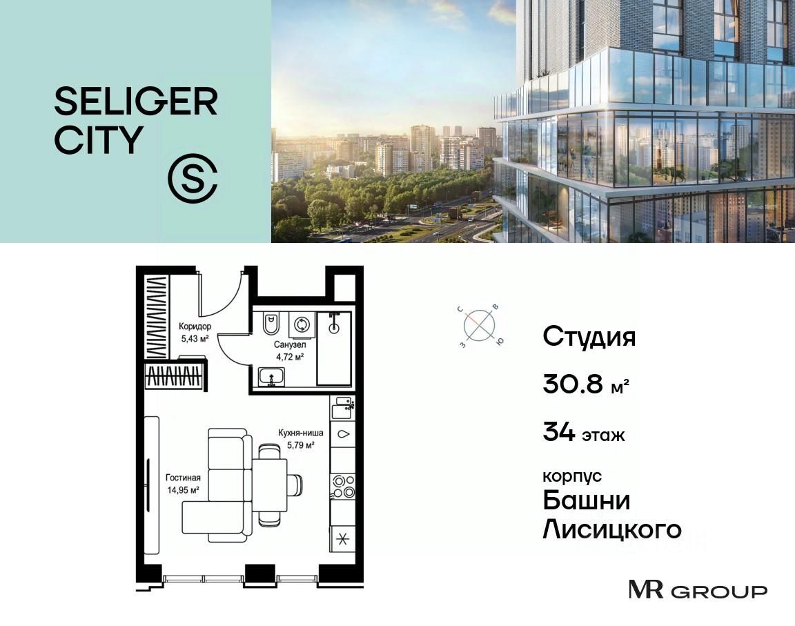 Продаётся студия общей площадью 30.89 м² без отделки в ЖК "Селигер Сити" на 34-м этаже башни Лисицкого.