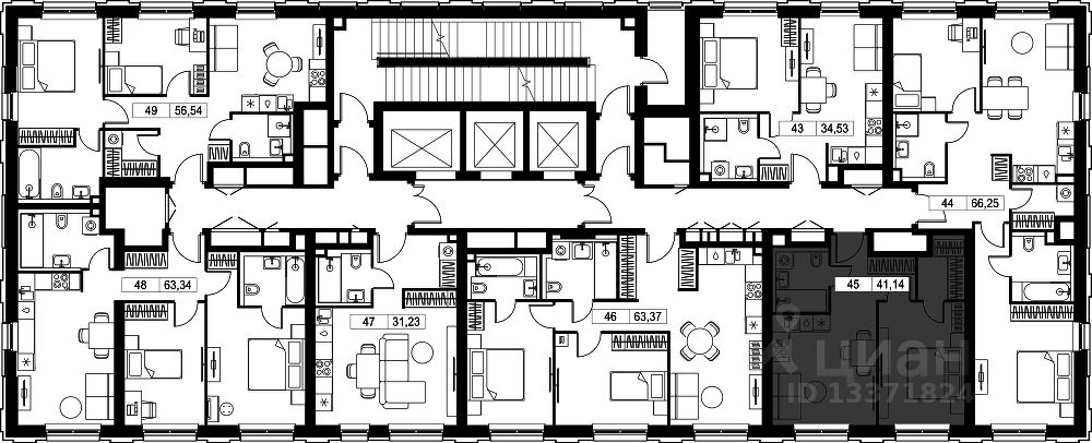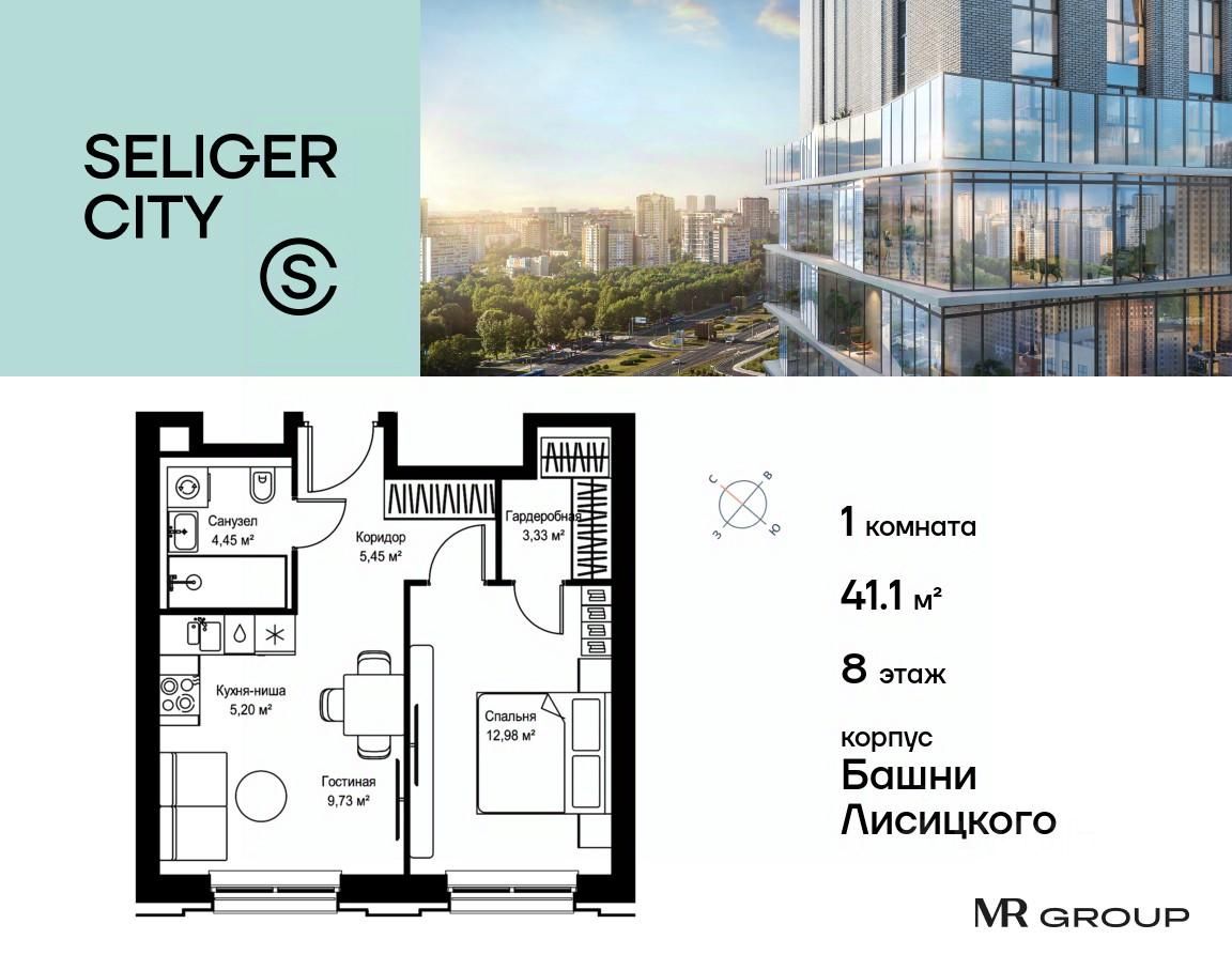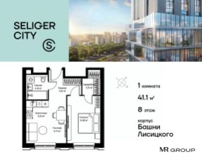 Продаётся 1-комнатная квартира общей площадью 41.14 м² без отделки в ЖК "Селигер Сити" на 8-м этаже башни Лисицкого.