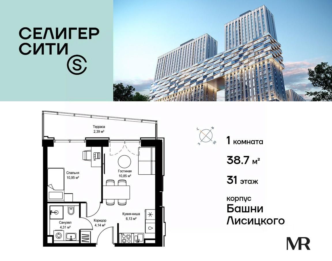 Продаётся 1-комнатная квартира общей площадью 38.77 м² без отделки в ЖК "Селигер Сити" на 31-м этаже башни Лисицкого.
