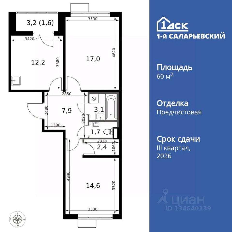 Продаётся 2-к квартира номер 314 общей площадью 60.5 кв.м. на 10-м этаже 14 этажного здания. Отделка Whitebox. Цена с учётом скидки.