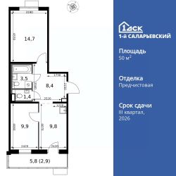Продаётся 2-к квартира номер 532 общей площадью 50.6 кв.м. на 21-м этаже 24 этажного здания. Отделка Whitebox. Цена с учётом скидки.