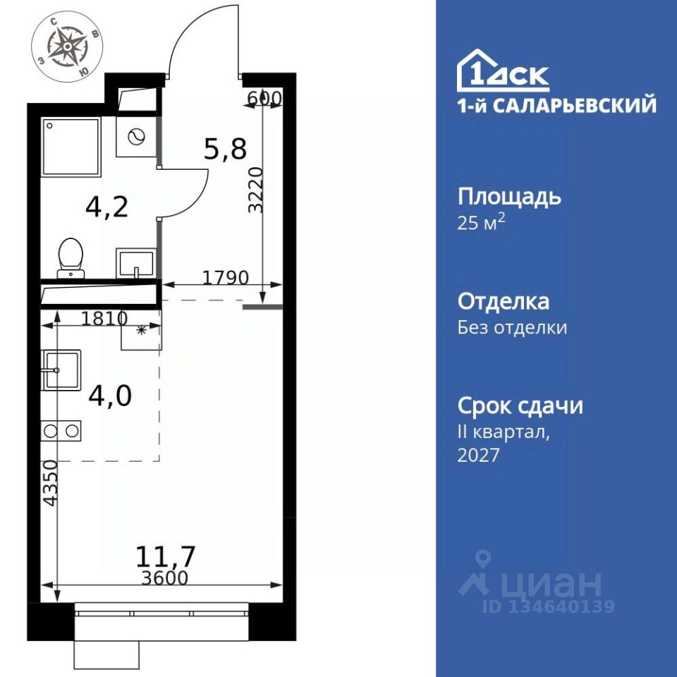 Продаётся квартира-студия номер 584 общей площадью 25.7 кв.м. на 20-м этаже 21 этажного здания. Без отделки. Цена с учётом скидки.