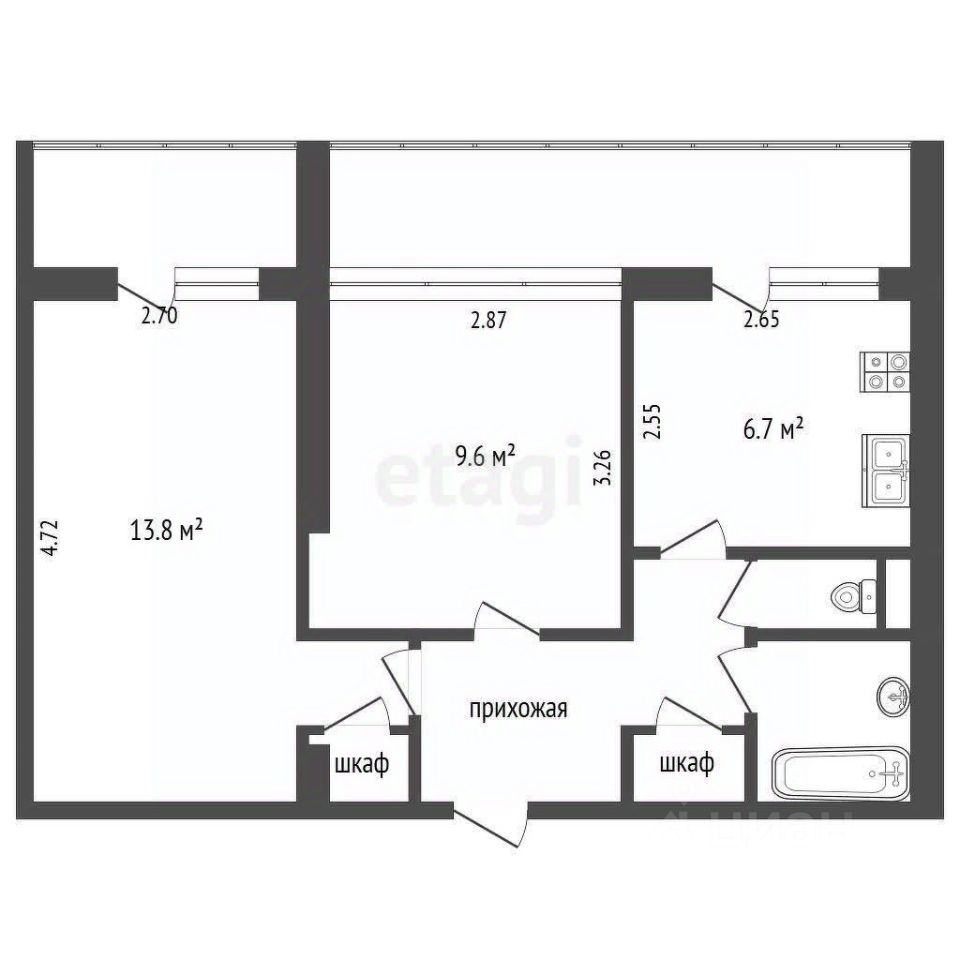 • Площадь: 44.2 кв.м, две изолированные комнаты и 2 просторных балкона