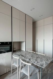 Кухня выполнена по индивидуальному заказу, с комплектующими Blum, материал столешницы и обеденного стола природный итальянский гранит Крема Crema Antico, посудомоечная машина 45 см, холодильник максимально большого размера, дополнительные системы хранения в цоколе кухни.