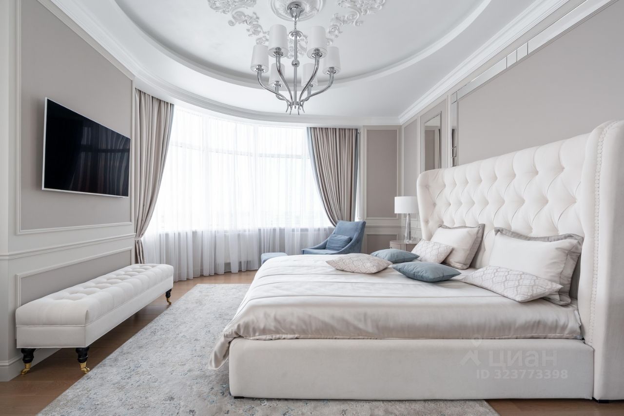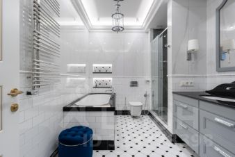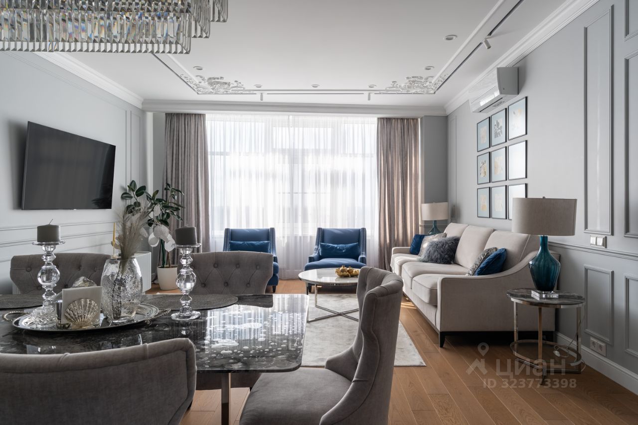 Общая площадь квартиры составляет 144 кв. м, из которых 44.7 кв. м просторная кухня. В квартире 3 спальни и 2 санузла.