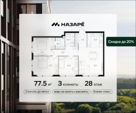 Предлагается квартира площадью 77.50 кв. м в новом современном квартале на востоке Москвы, прямо у станций метро и МЦК "Бульвар Рокоссовского". Квартира располагается в корпусе 3 на 28 этаже комплекса бизнес-класса "НАЗАРЕ'".