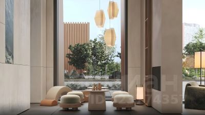 • дизайнерские лобби от бюро ABOVE ARCHITECTURE с панорамными окнами, интерьерами в теплой цветовой гамме и мягкой зоной ожидания располагаются в каждой башне;