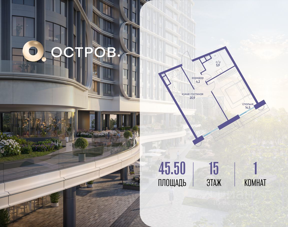 Продаётся однокомнатная квартира от застройщика: общая площадь 45.50 м², жилая 14.50 м², кухня 20.90 м², 15, жилой квартал "Остров 7", корпус 7 (7 квартал) (секция 2). срок сдачи: 4-кв. 2025.
