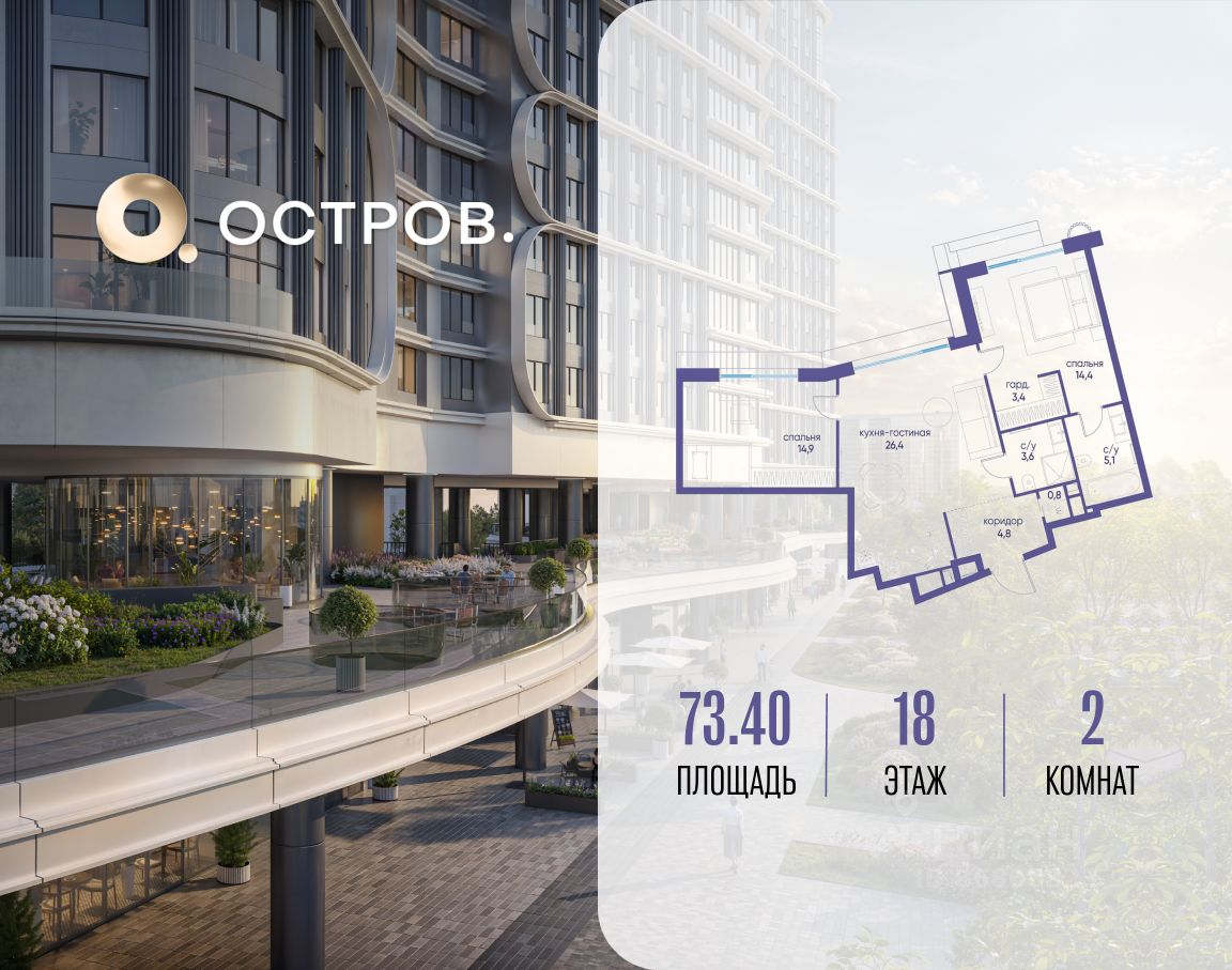 Продаётся двухкомнатная квартира от застройщика: общая площадь 73.40 м², жилая 29.30 м², кухня 26.40 м², 18, жилой квартал "Остров 7", корпус 7 (7 квартал) (секция 2). срок сдачи: 4-кв. 2025.