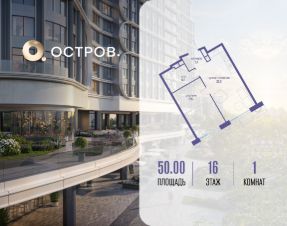 Продаётся однокомнатная квартира от застройщика: общая площадь 50.00 м², жилая 17.50 м², кухня 23.30 м², 16, жилой квартал "Остров 7", корпус 7 (7 квартал) (секция 2). срок сдачи: 4-кв. 2025.