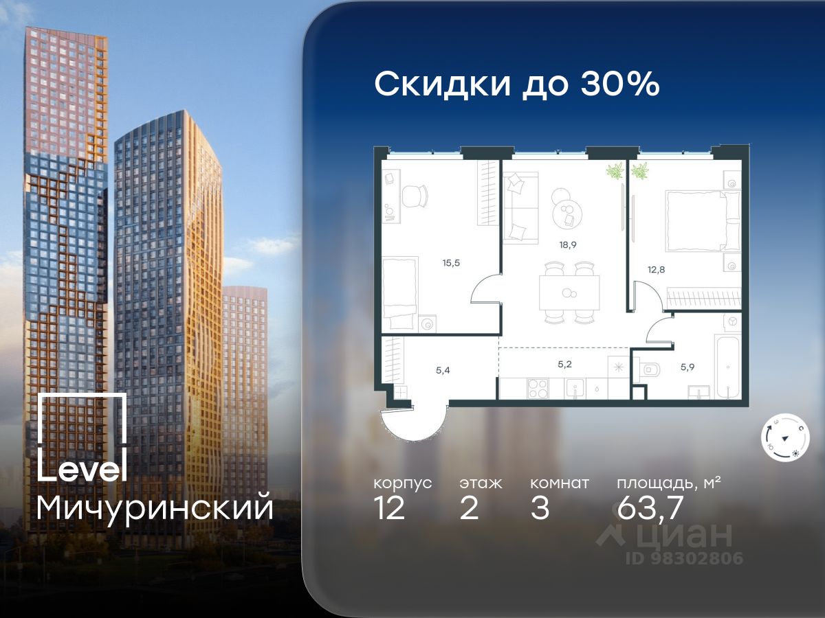 В жилом квартале, расположенном на границе с природным заказником "Долина реки Очаковки", продаётся 3-комнатная квартира площадью 63.70 кв.м без отделки. Квартира расположена на 2 этаже 11-этажного корпуса 12 в жилом комплексе бизнес-класса Level Мичуринский (компания Level Group/Левел групп).