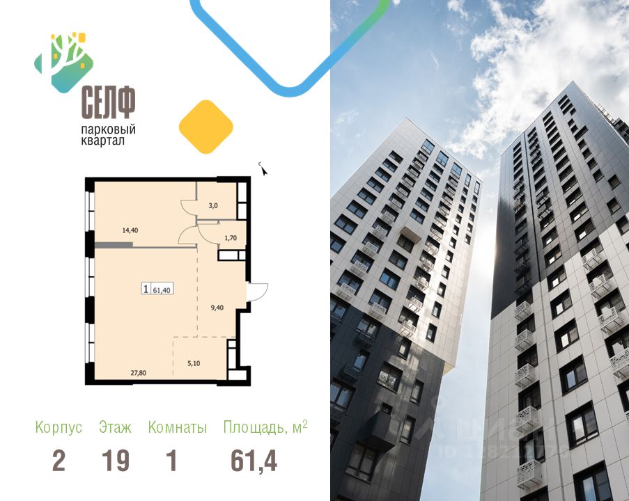 Продается просторная и светлая квартира площадью 61.4 кв. м. на 19 этаже в современном ЖК Парковый Квартал Селф. Дом сдан - ключи в день покупки! Семейная ипотека от 5,99%.
