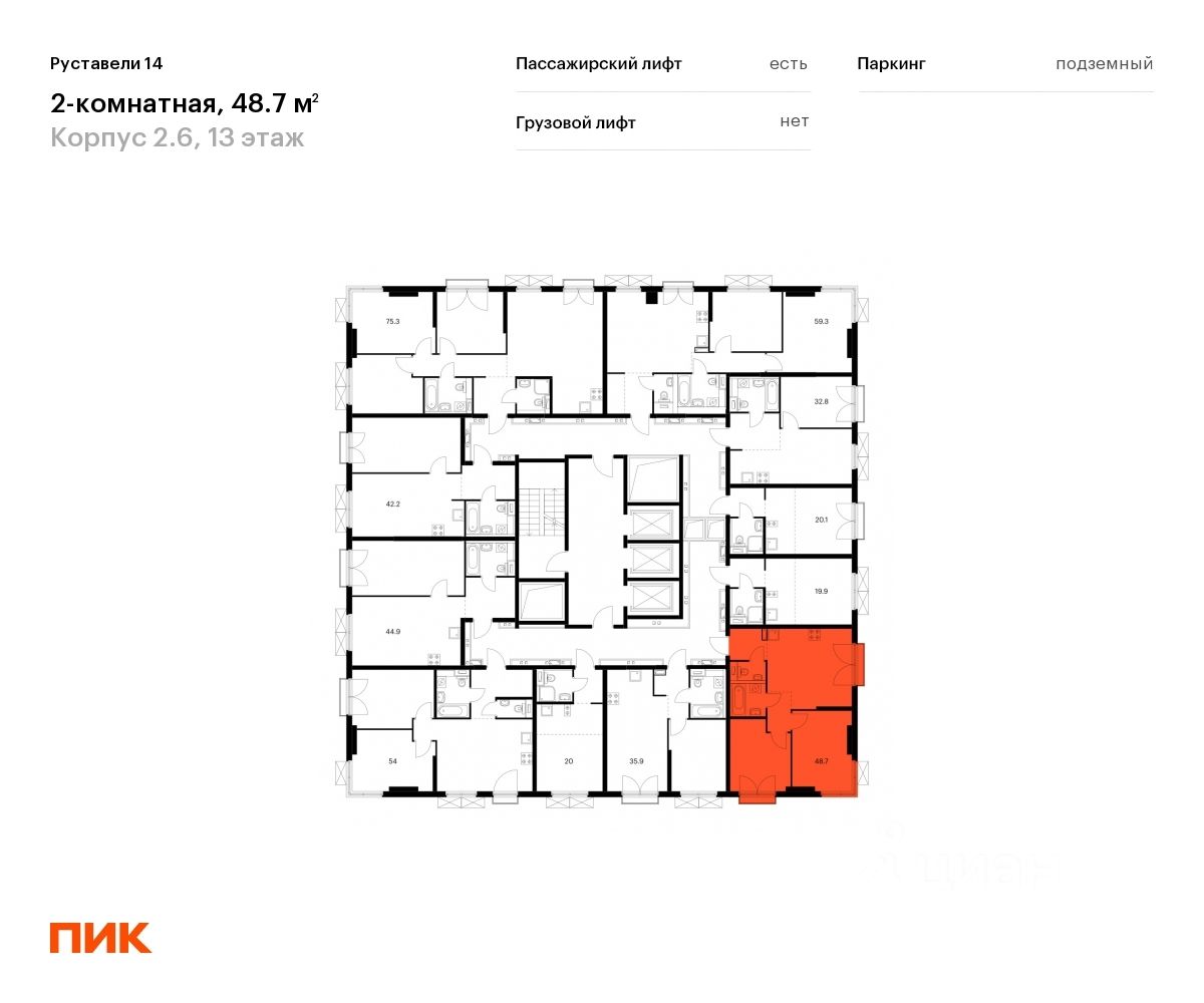 Продаётся 2-комн. квартира площадью 48,7 кв.м на 13 этаже 23 этажного дома (Корпус 2.6, Секция 2) проекта ПИК Руставели 14. Светлый просторный подъезд на уровне земли, функциональная планировка, большие окна, c отделкой.