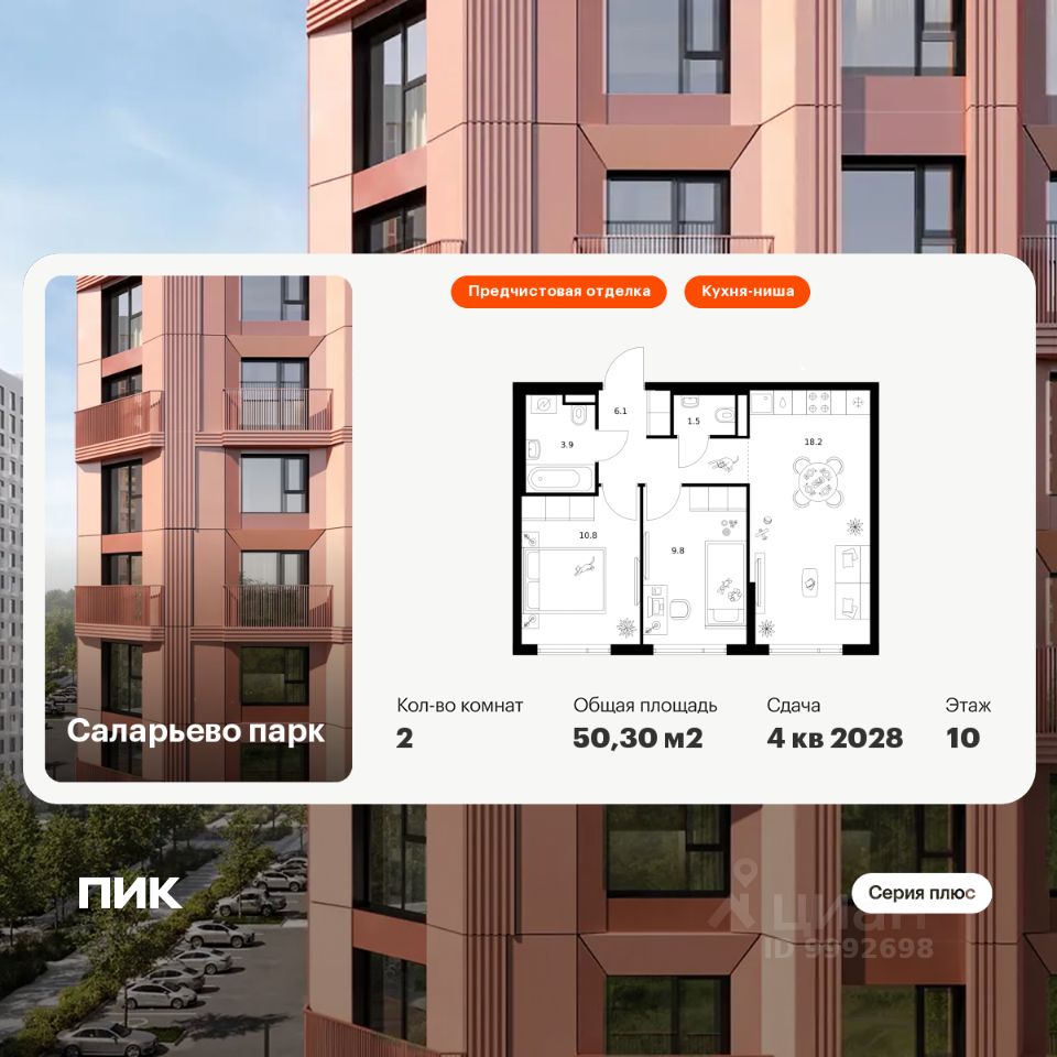 Продаётся 2-комн. квартира площадью 50,3 кв.м на 10 этаже 24 этажного дома (Корпус 82.4, Секция 4) проекта ПИК Саларьево парк. Светлый просторный подъезд на уровне земли, функциональная планировка, большие окна, предчистовая отделка.