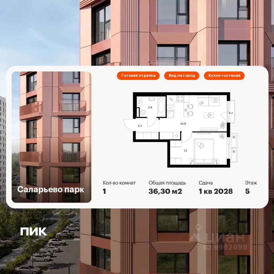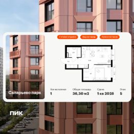 Продаётся 1-комн. квартира площадью 36,3 кв.м на 5 этаже 18 этажного дома (Корпус 74.9, Секция 9) проекта ПИК Саларьево парк. Светлый просторный подъезд на уровне земли, функциональная планировка, большие окна, c отделкой.