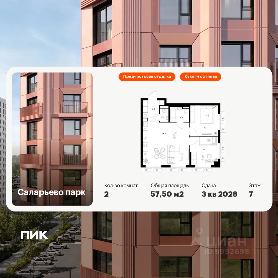 Продаётся 2-комн. квартира площадью 57,5 кв.м на 7 этаже 23 этажного дома (Корпус 69.1, Секция 1) проекта ПИК Саларьево парк. Светлый просторный подъезд на уровне земли, функциональная планировка, большие окна, предчистовая отделка.