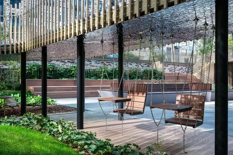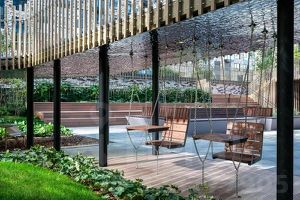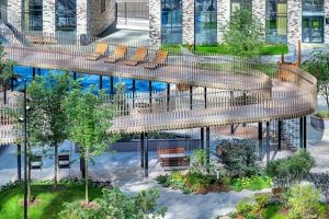 Уникальный двухуровневый двор, многофункциональный пешеходный мост, большой игровой комплекс, большое количество зеленых насаждений, декоративное освещение, тихие лаунж для зоны с гамаками, open space с уличными рабочими кабинетами, амфитеатр на центральной площади двора, большой детский комплекс с пляжем-песочницей
