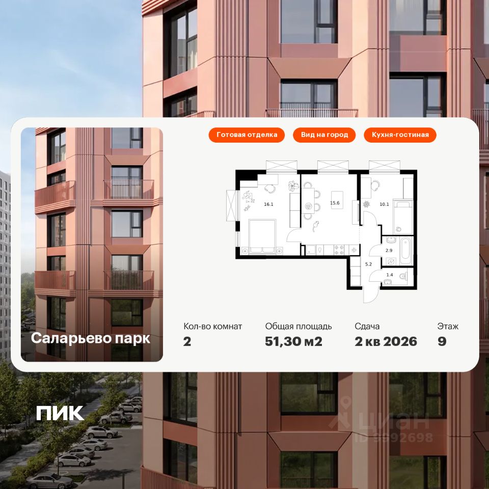 Продаётся 2-комн. квартира площадью 51,3 кв.м на 9 этаже 17 этажного дома (Корпус 20, Секция 1) проекта ПИК Саларьево парк. Светлый просторный подъезд на уровне земли, функциональная планировка, большие окна, c отделкой.