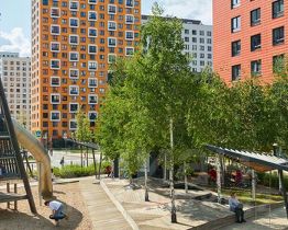 Все корпуса в квартале гармонично сочетаются, образуя единую городскую среду. Между собой их объединяет невысокая этажность и натуральная цветовая гамма. Здесь приятно гулять и проводить время на улице всей семьёй.