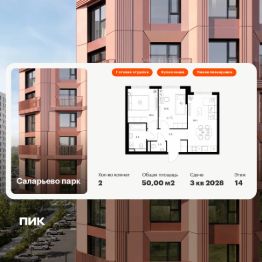 Продаётся 2-комн. квартира площадью 50 кв.м на 14 этаже 14 этажного дома (Корпус 69.7, Секция 7) проекта ПИК Саларьево парк. Светлый просторный подъезд на уровне земли, функциональная планировка, большие окна, c отделкой.