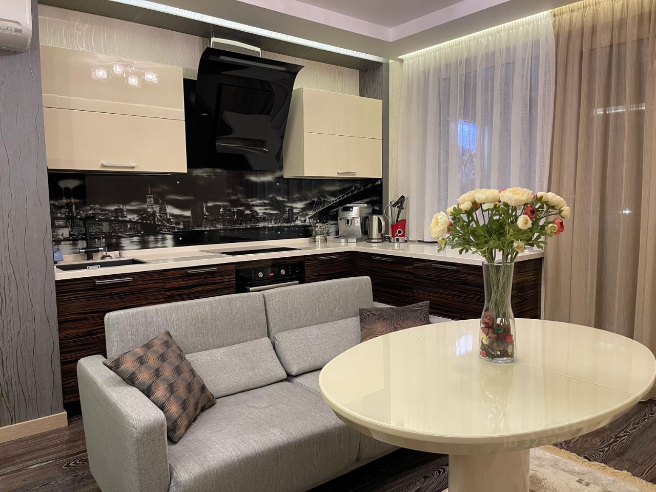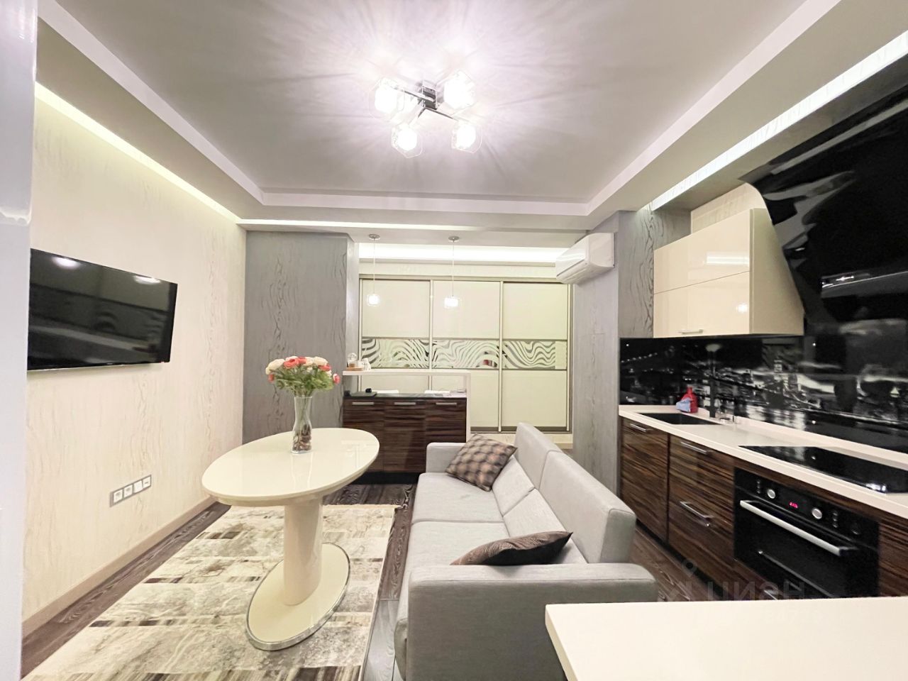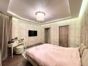 Много места для хранения вещей. В спальне просторная гардеробная с установленной системой хранения. В гостиной установлен большой встроенный шкаф. Установлен кондиционер. Многоуровневое освещение. Лоджия утеплённая.