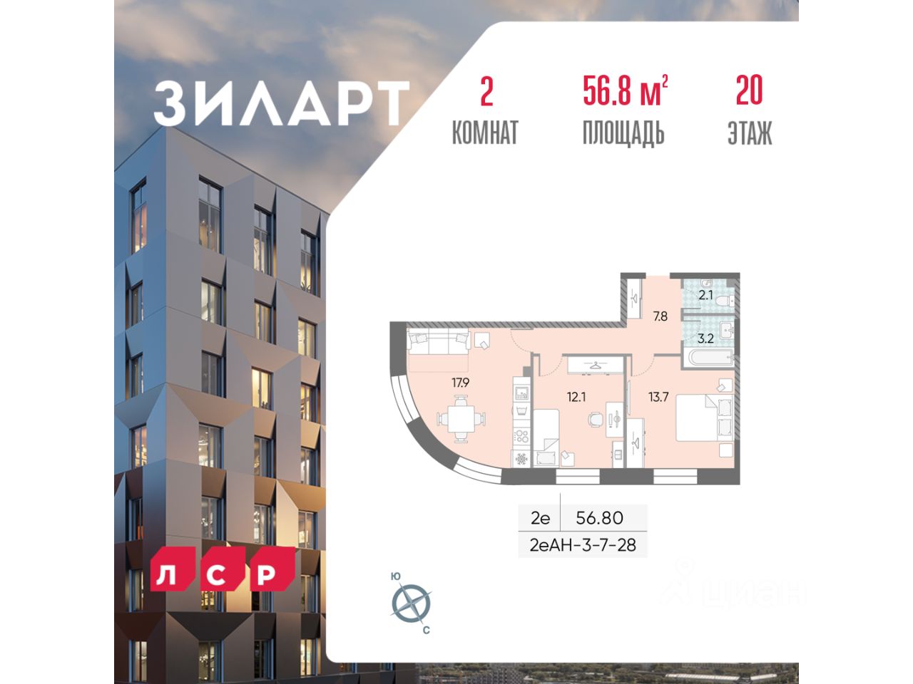Продаётся 2-комнатная квартира в доме 18 (ЗИЛАРТ ГРАНД) ЖК "ЗИЛАРТ" общей площадью 56.8 кв. метров на 20 этаже.