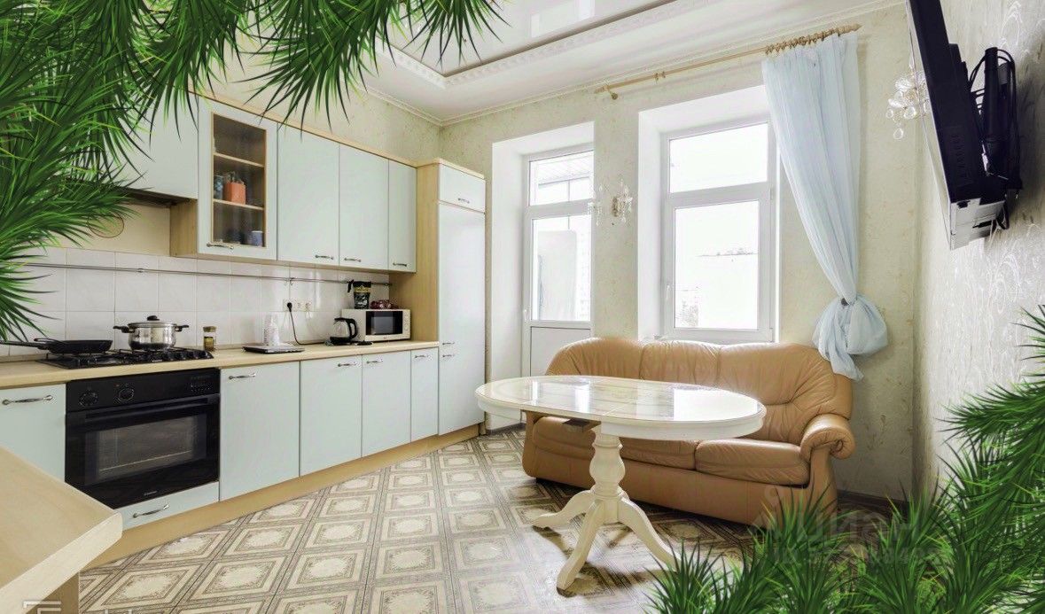 Современная кухня с встроенной мебелью и высококлассной бытовой техникой, ванная комната и санузел оборудованы современной сантехникой.