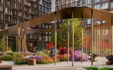 Закрытая благоустроенная территория площадью 5 га, размещены современные детские и спортивные площадки, зоны отдыха с шезлонгами, фонтан и зона коворкинга.