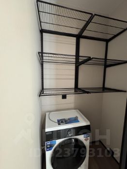 ~Постирочная с новой современный стиральной машинкой и зонами хранения