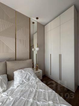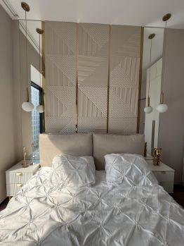 ~ Светлая , уютная спальня с дизайнерским изголовьем , большой кроватью и вместительным шкафом .