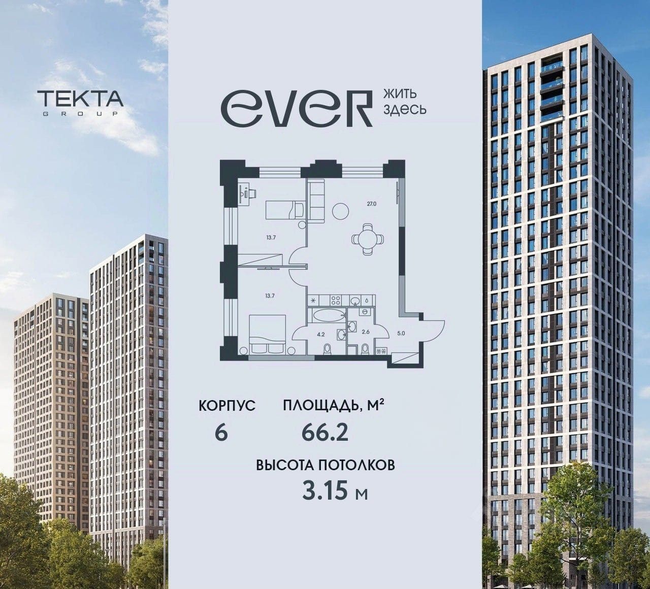 Евро 3-комн. квартира в ЖК "Ever" Корпус 6, этаж 7. Общая площадь: 66.2 кв.м., жилая: 42.7 кв.м. Высота потолков 3.15 м. Переуступка прав требования. Ключи до 1 апреля 2026 года. Без отделки. Жилой комплекс EVER — это гармоничное сочетание динамики мегаполиса и умиротворенности природы. Всего семь минут неспешной прогулки отделяют вас от станции метро ""Калужская"", обеспечивая быстрый доступ ко всем преимуществам жизни в Москве. Вернувшись домой, вы попадаете в атмосферу спокойствия и комфорта. Продуманная инфраструктура комплекса включает в себя не только уютные квартиры, но и удобный подземный паркинг, избавляющий вас от хлопот с поиском места для парковки, а также индивидуальные кладовые помещения, где можно хранить все необходимое. В EVER вы найдете идеальное сочетание комфорта и удобства, позволяющее наслаждаться всеми преимуществами жизни в столице, не забывая о важности спокойствия и близости к природе.