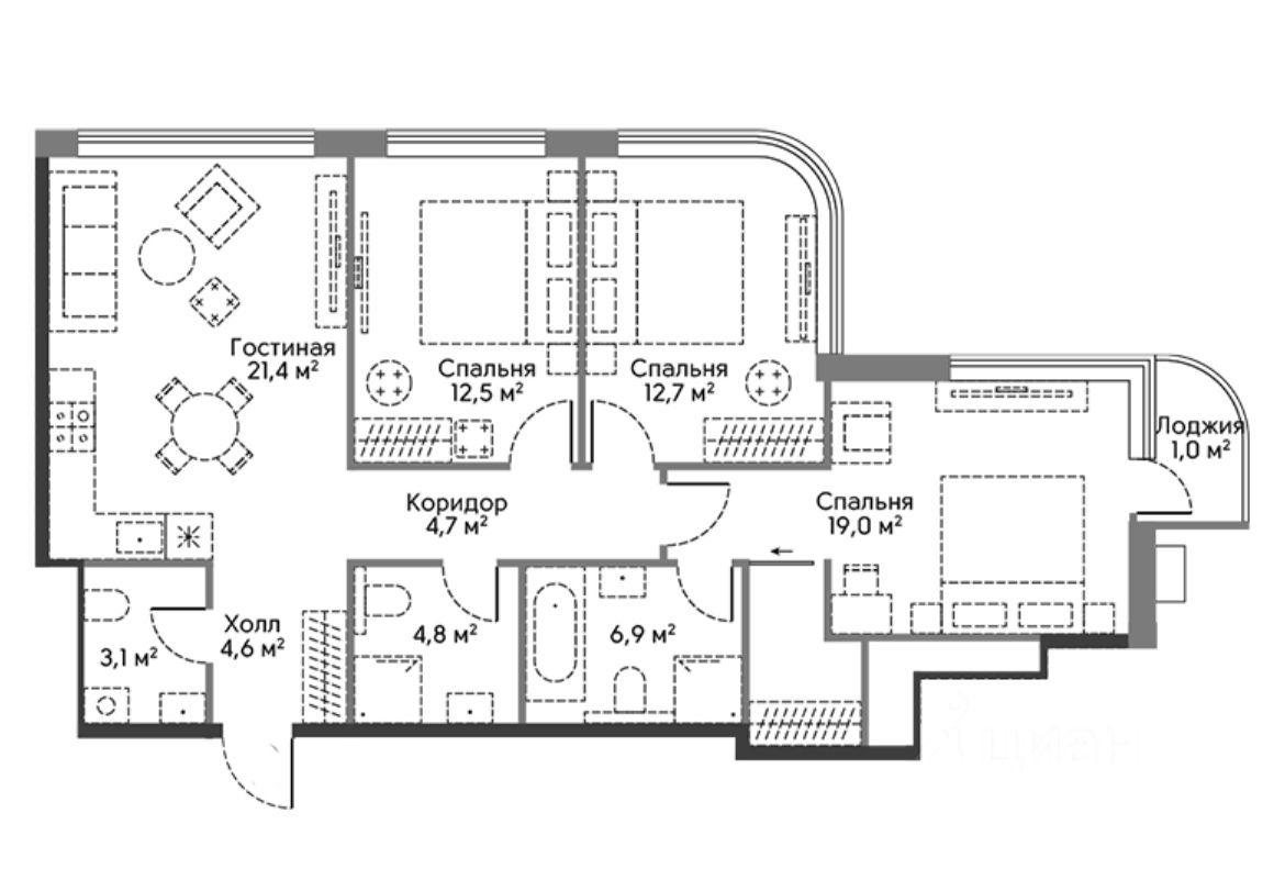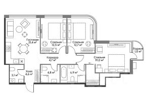 Площадь комнат - 19-12.7-12.5м.кв.