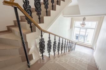Презентабельный подъезд с дубовыми подоконниками, коваными ограждениями и изящными люстрами.