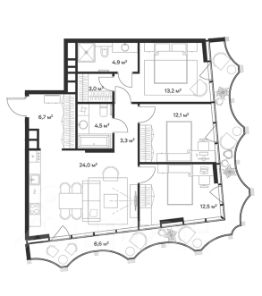 Функциональная планировка: просторная кухня-гостиная, мастер-спальня, 2 изолированные детские, из каждой комнаты есть выход на террасу, совмещенный санузел, коридор с местом под хранение.