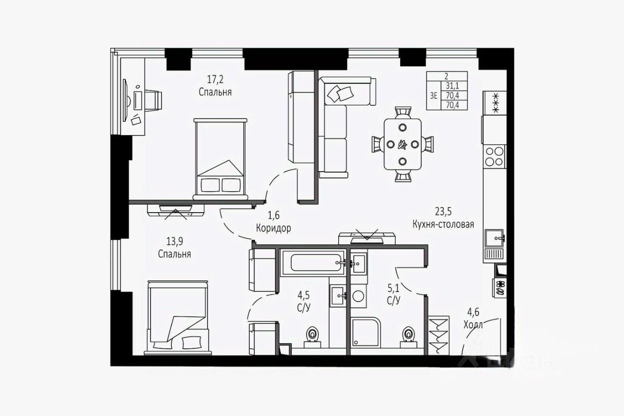 -количество комнат — 2;