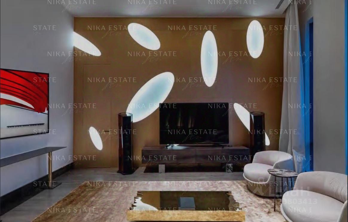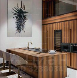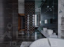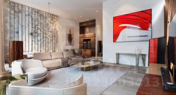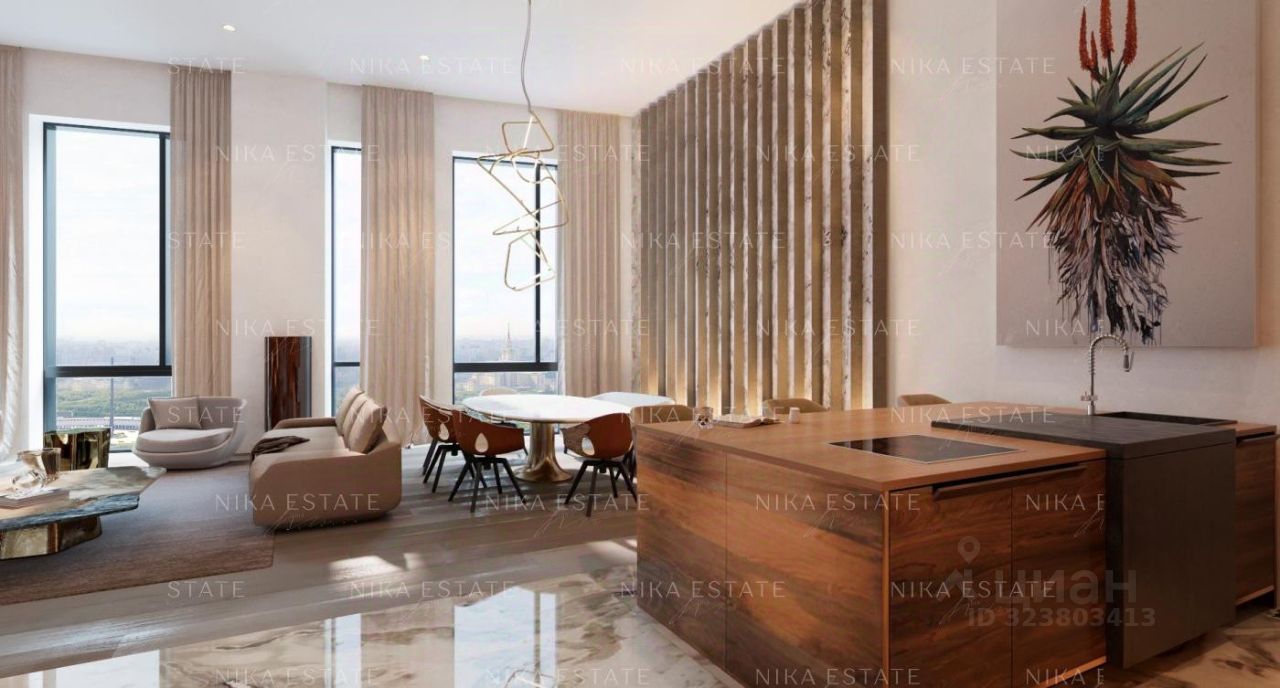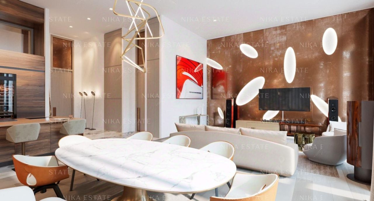 Уникальная. Именно это слово приходит в голову при виде этой квартиры. При довольно внушительной площади здесь небольшое количество функциональных зон. Квартиру разделили на две равные части: блок со спальней и ванной и зону гостиной с кухней и столовой зоной. Основная задача была сделать интерьер эффектным и вдохновляющим. Стена - перегородка с подсветкой в виде эллипсов между спальней и гостиной - яркий и знаковый элемент проекта. Интерьер довольно строг и лаконичен: тёмный пол, гладкие светлые стены, однотонный текстиль. В квартире хотели создать нечто, что разрушит жёсткую геометрию пространства, что-то необычное и молниеносно притягивающее взгляд. Кухня из окаменелого дерева по авторскому проекту. Изготовлена фабрикой Toncelli и облицована окаменелым деревом fossil. Благодаря своим особенным свойствам и прочности такое дерево можно использовать не только для фасадов, но и для рабочих поверхностей кухни. Световое окно над кухней пропускает дневной свет в гостевую ванную комнату. Барные стулья Hexagon, Henge. Живопись авторства Курта Пио. Стена в зоне столовой - настоящий арт-объект: это особенно спроектированная конструкция, грани которой облицованы мрамором Dover White и тонированным деревом. Стол Giorgetti.Стулья Poltrona Frau. Номер в базе: J27172