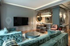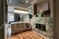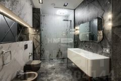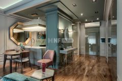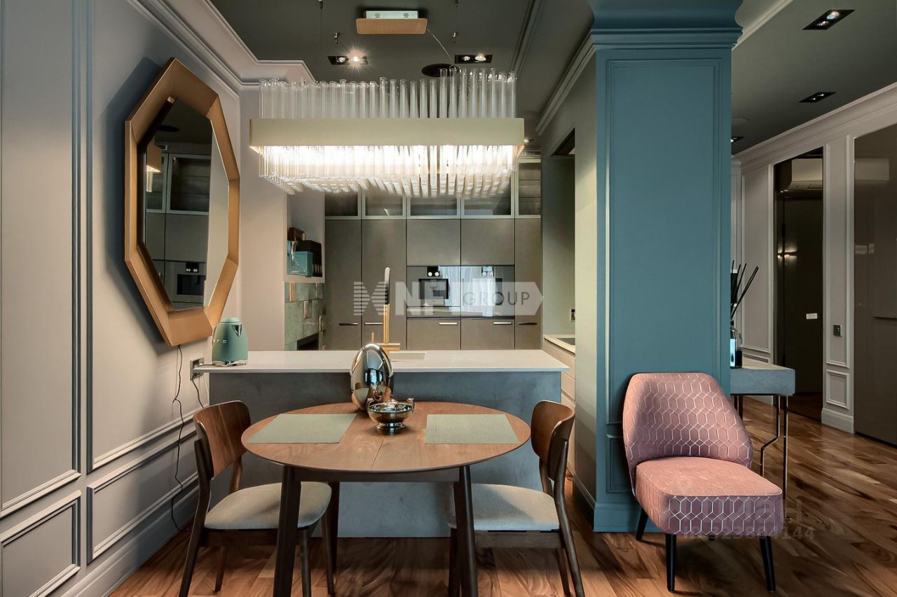Пространство оформлено в современном стиле с применением натуральных отделочных материалов, установлена мебель, сантехника и бытовая техника от ведущих мировых производителей.