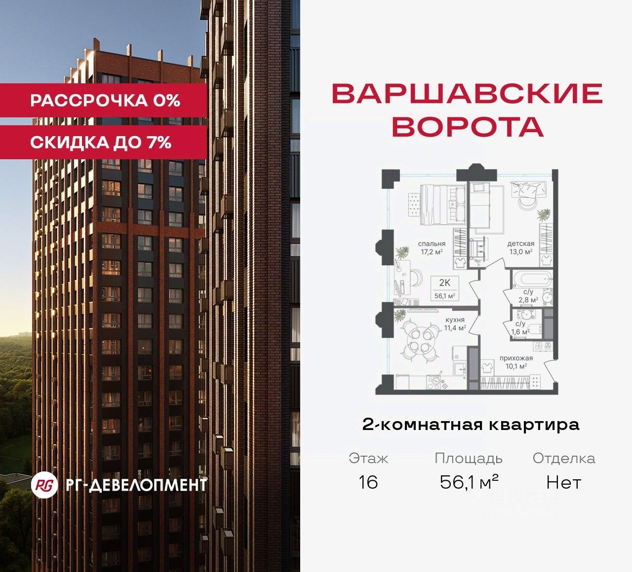 Продаётся 2-комнатная квартира 56,1 кв.м. в МФК "Варшавские ворота" на 16-м этаже 30 этажного дома. МФК "Варшавские ворота" — это точка баланса между природой и городом, стилем и функциональностью, жизнью сегодня и устойчивым будущим.