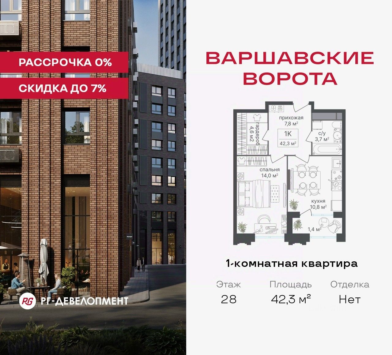 Продаётся 1-комнатная квартира 42,3 кв.м. в МФК "Варшавские ворота" на 28-м этаже 30 этажного дома. МФК "Варшавские ворота" — это точка баланса между природой и городом, стилем и функциональностью, жизнью сегодня и устойчивым будущим.