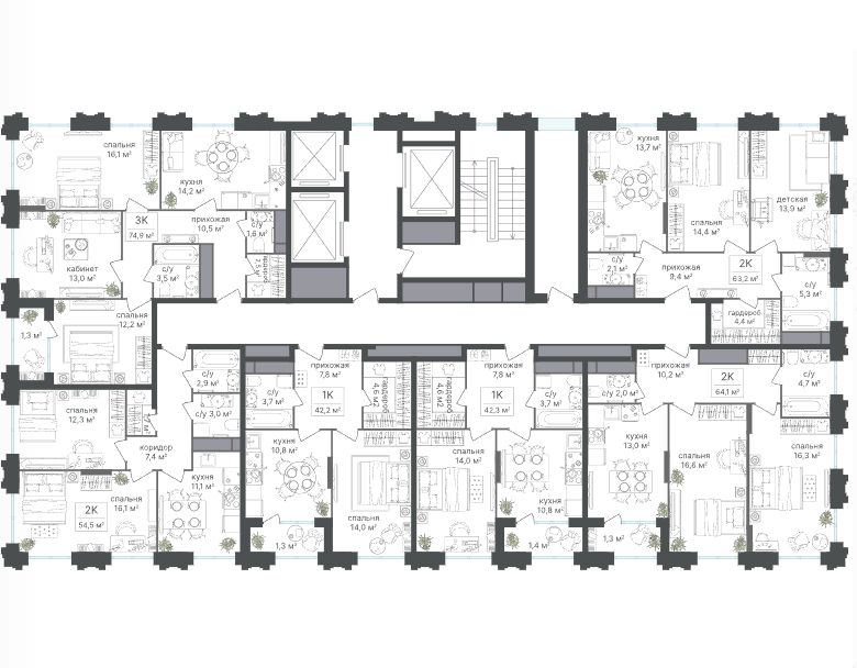 Среди планировочных решений представлены разнообразные форматы: от функциональных студий до просторных 4-комнатных квартир и апартаментов площадью от 22 до 105 м². Высокие потолки усиливают ощущение простора, а продуманные планировки включают мастер-спальни, гардеробные, угловые окна, объединённые кухни-гостиные и несколько санузлов.