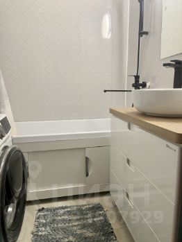 В ванной расположена стиральная машина со шкафом для стиральных порошков.