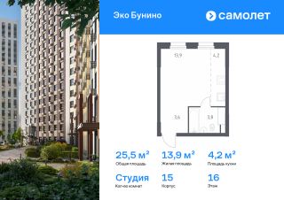 Строим кварталы для жизни с заботой о будущем. Предлагается квартира студия комфорт-класса 25,5 кв.м в корпусе 15 на 16 этаже, в ЖК "Эко Бунино"