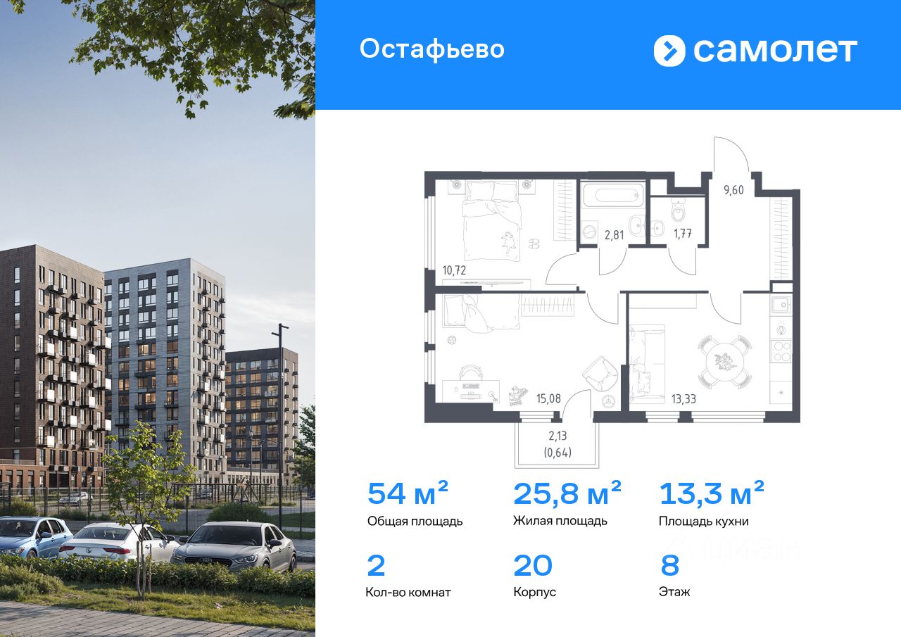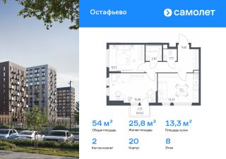 Строим кварталы для жизни с заботой о будущем. Предлагается 2-комнатная квартира комфорт-класса 53,95 кв.м в корпусе 20 на 8 этаже, в ЖК "Остафьево"