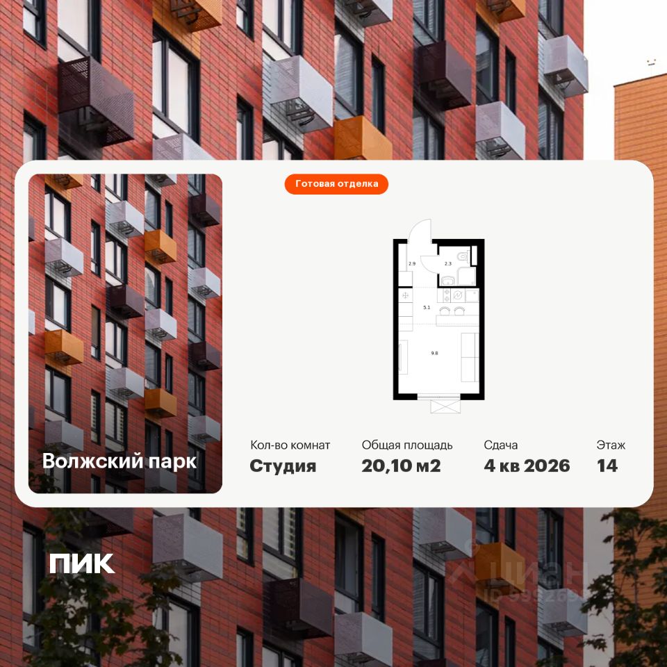 Продаётся квартира-студия площадью 20,1 кв.м на 14 этаже 24 этажного дома (Корпус 6.2, Секция 3) проекта ПИК Волжский парк. Светлый просторный подъезд на уровне земли, функциональная планировка, большие окна, c отделкой.