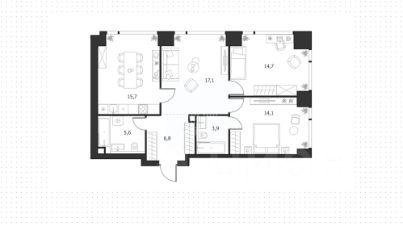 Благодаря панорамному остеклению пространство наполнено светом, из окон открываются виды в зелёный двор и на академию ФСБ. Высота потолков 3,10 метров. Возможно спланировать гостиную, кухню-столовую, мастер-спальню со своим санузлом, вторую спальню, ванную комнату и прихожую.