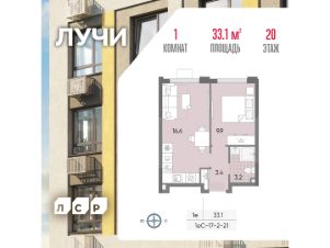 Продается 1-комнатная квартира общей площадью 33.1 кв. метров на 20 этаже жилого комплекса Лучи.